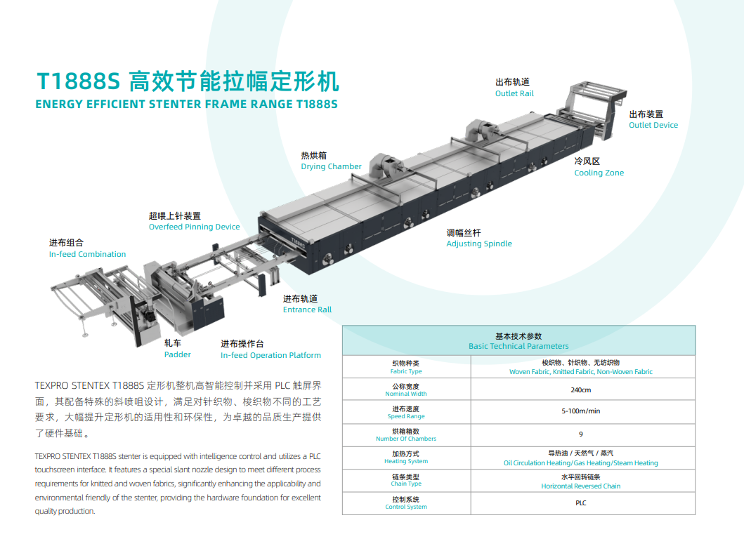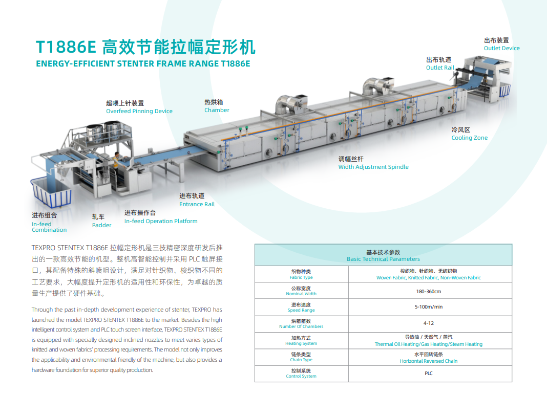 產(chǎn)品簡介:TEXPRO STENTEX T1886E 拉幅定形機是三技精密深度研發(fā)后推 出的一款高效節(jié)能的機型。整機高智能控制并采用 PLC 觸屏接 口,其配備特殊的斜噴咀設(shè)計,滿足對針織物